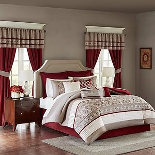 Madison Park Essentials Jelena バッグ入りルームインア フェイクシルク 掛け布団 クラシック 豪華 オールシーズンダウン 代替品 寝具 お揃いのベッドスカート カーテン 装飾枕 キング(104インチx92インチ) レッド 24ピース