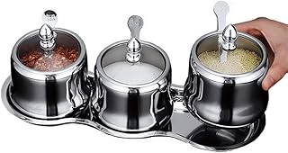 Tenta Tenta Kitchen 18/8ステンレススチール 調味料ボックス 調味料ジャーセット スパイスジャー スパイスラック 調味料入れ 容器 容器 容器 塩 胡椒 砂糖 収納 オーガナイザー 3杯分スプーン付き (ガラス蓋)