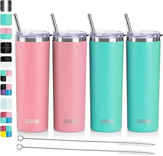 Koodee 20オンス ステンレススチール スキニータンブラー (4パック) 二重壁断熱ウォータータンブラーカップ 蓋4個、ストロー4本、ストローブラシ2本付き (ティール/2パック、ピンク/2パック)