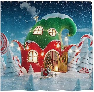 Allenjoy 72 x 72インチ クリスマス キャンディケーン ハウス シャワーカーテンセット フック12個 冬 夜 雪の結晶 松 杖 砂糖 バスルーム カーテン 丈夫 防水 生地 バスタブセット ホームインテリア