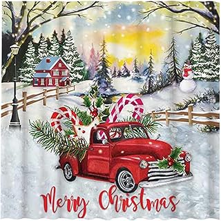 Allenjoy 72 x 72インチ 水彩 メリークリスマス シャワーカーテン バスルームセット レッド トラック 冬 雪だるま ホーム バスタブ 装飾 耐久性 防水 生地 洗濯機可 フック12個付き