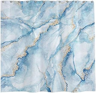 Allenjoy 72x72インチ マーブルシャワーカーテン ホワイトライトブルー ミックスゴールデンひび割れラインパターン テクスチャ バスルームカーテン 丈夫な防水生地 浴槽セット ホームインテリア フック12個付き