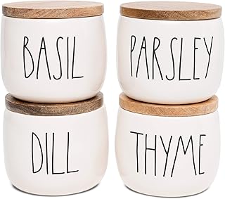 Rae Dunn ハーブジャー 木製蓋付き キッチンジャー ハーブやスパイス用 蓋付き調味料容器 タイム バジル パセリ ディル用ハーブジャー 4個セット